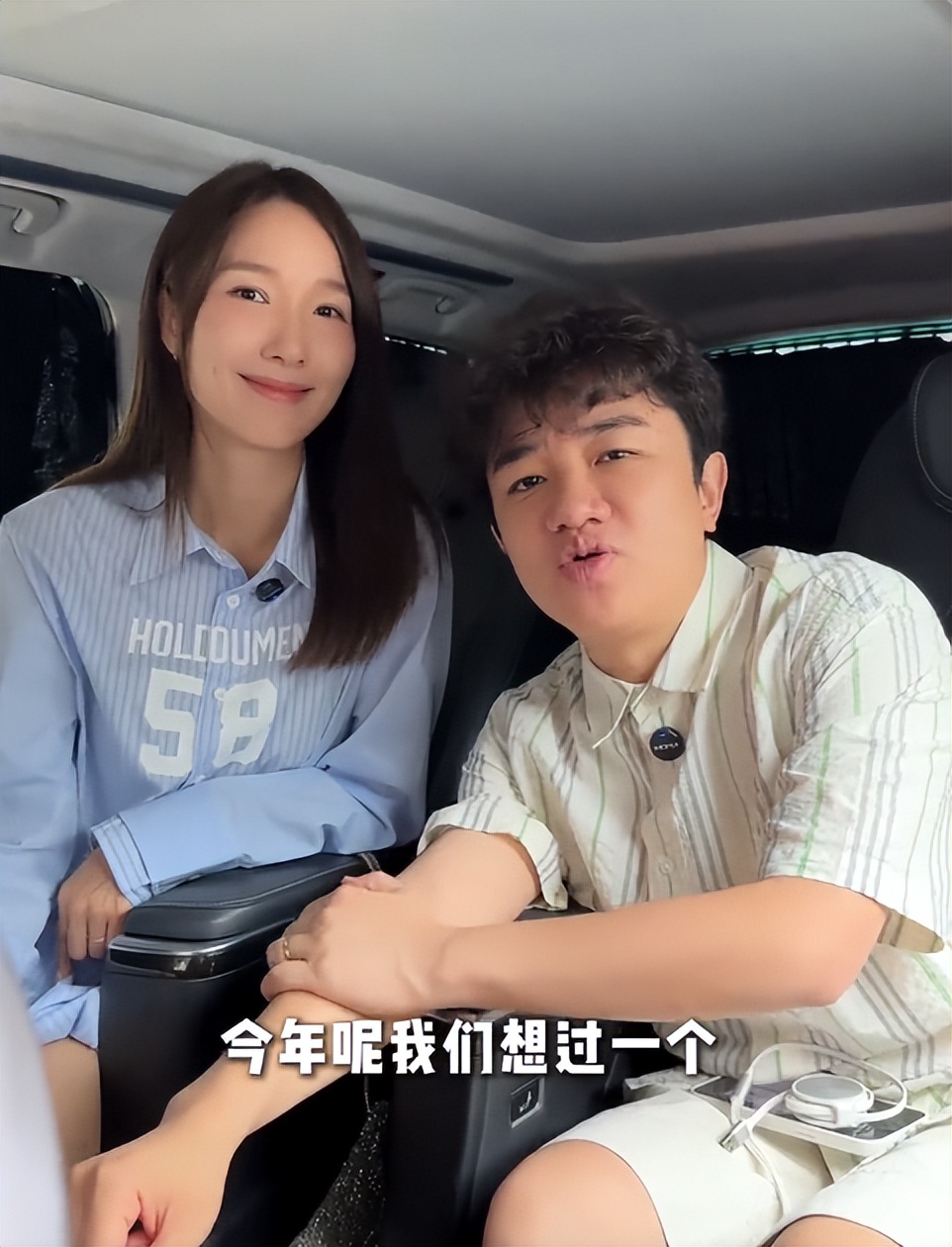 妻子李亚男坐在他旁边,她穿着一件浅蓝色连衣裙,款式比较休闲。